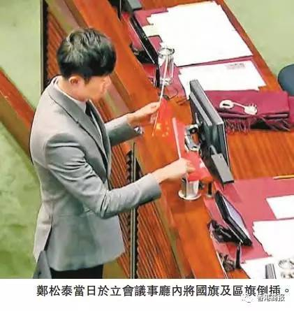 2016年10月19日,激进“本土派”“热血公民”主席、立法会议员郑松泰在立法会会议厅内,把建制派议员桌上的国旗及区旗倒转。他被指涉嫌公开及故意以玷污的方式侮辱国旗及区旗,有关案件将于下月7日审讯。