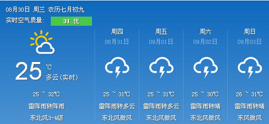 首先看天气,今天多云,午后有时阴,有阵雨或雷雨,东北风3-4级,最高气温32度,明天多云,气温25-31度。