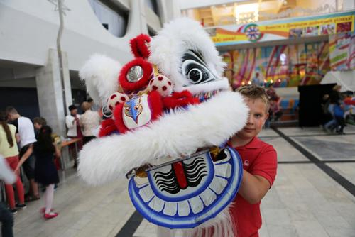 6月22日,在白俄罗斯首都明斯克,一个孩子手举舞狮道具 魏忠杰摄
