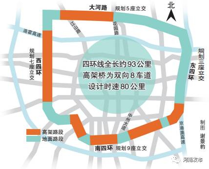 根据规划,四环快速化按城市快速路设计,规划高架桥均为双向8车道,设计车速每小时80公里。目前,四环线及大河路快速化工程勘察设计总承包开始招标,年内将启动建设。
