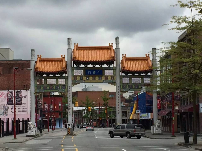 温哥华唐人街,千禧门。在阴沉天气映衬下,唐人街更显寂寥。