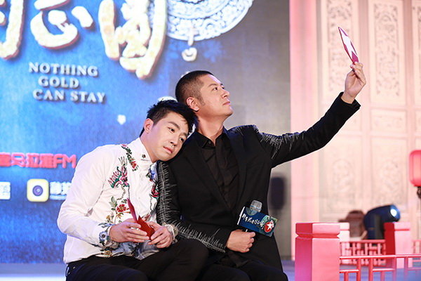 俞灏明和任重在发布会现场游戏互动。