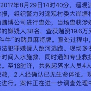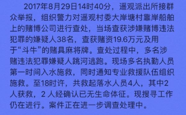 抓捕现场。视频截图查处过程中,多名涉赌违法犯罪嫌疑人跳河逃跑。现场多名执勤人员第一时间入水施救,同时通知专业救援队伍组织施救。至18时许,共救起落水人员4人,其中2人经确认已无生命体征。现搜寻工作仍在进行。案件正在进一步调查处理中。