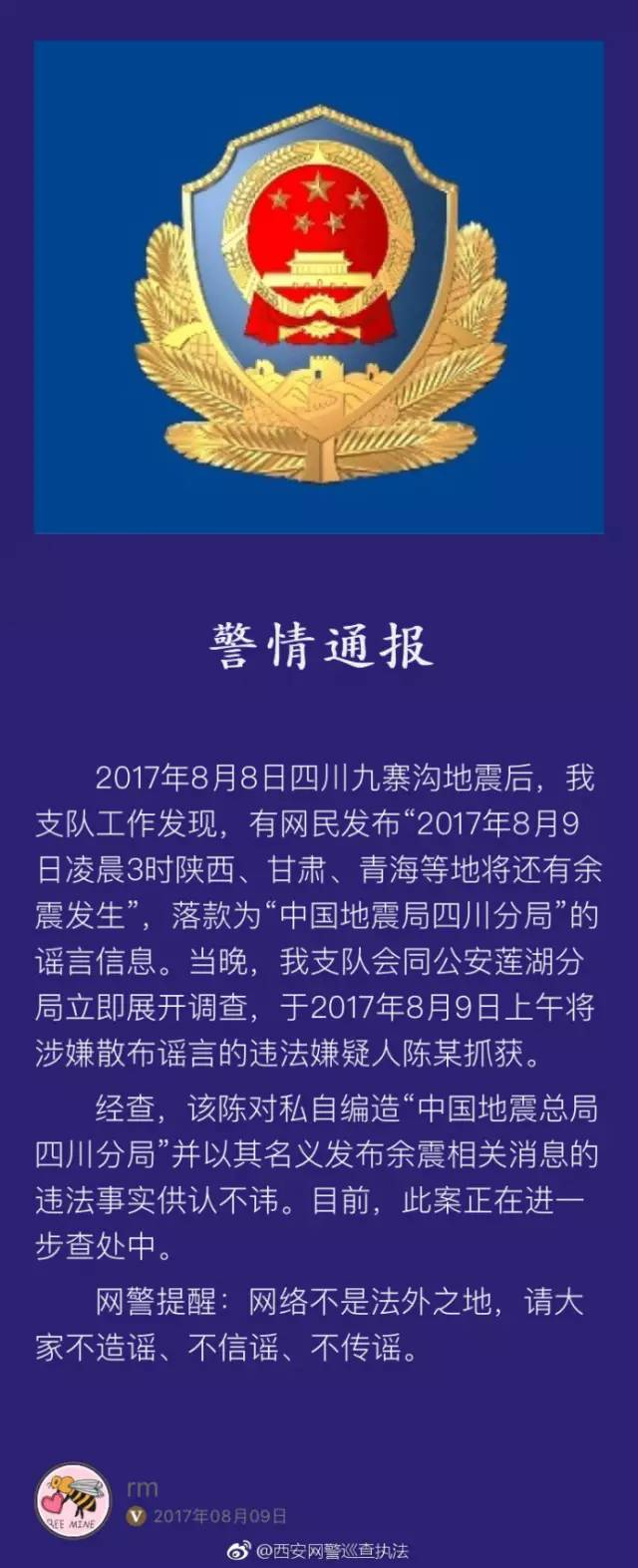 谣言:九寨沟地震发生之后,有人在微信群发布所谓“通知”,称“2017年8月9日3时左右会再次发生余震,届时西安、汉中、安康、兰州、张掖、西宁等地将会被波及。