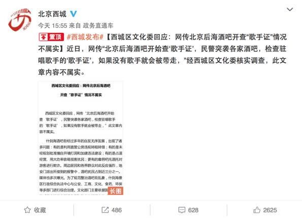谣言:8月23日,某微信公众号发布信息称:“几天前,北京后海酒吧开始查‘歌手证’——民警突袭各家酒吧,检查驻唱歌手的歌手证,如果没有,歌手就会被带走,乐器、音箱等也被没收”。随后,该信息在微博等社交媒体上被广泛传播。