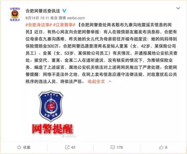真相:8月14日下午,合肥网警巡查执法通过微博发布消息称,两名保险公司员工为推销保险业务编造上述谣言,已被公安机关严肃处理。