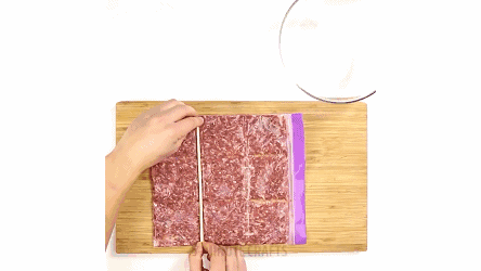 猪肉脯好吃美味,自己在家也可以做哦!准备一个带封条的保鲜袋,一根筷子,把瘦肉切成肉泥,装进保鲜袋里,均匀铺平,用筷子压出想要的大小。