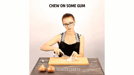 边嚼口香糖边切可以分散注意力,让泪液不会集中在眼睛里,而是转移到口腔里,就不会流眼泪了。