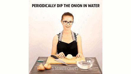 切之前把剥好皮的洋葱在水里浸一下,把洋葱切两瓣后,再蘸一次水,让洋葱里的刺激物溶解在水里。