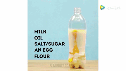 煎饼的面糊搅拌起来很费力,但是有了塑料瓶,连搅拌机都不需要,只用把材料装进干净的瓶子里,然后摇摇摇,里面的面粉、鸡蛋、牛奶、水什么的就能混合均匀了。