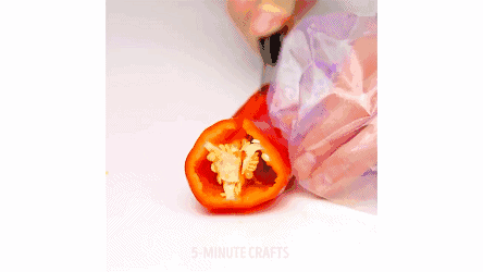 切辣椒容易辣手,用保鲜袋套住手,不让手直接碰到辣椒籽就好啦。