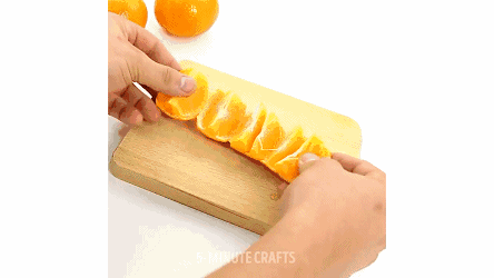 把橙子两头切掉,在一边划一刀,从划开的地方往两边剥开,像剥桔子一样把橙子分瓣剥开,吃起来很方便。