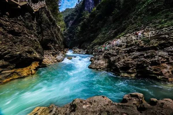 大七孔栈道起于新大七孔桥头左岸,止于著名景点恐怖峡铁索桥桥头。