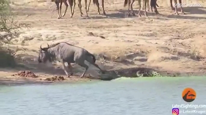 他们本来是在拍摄河对岸正在悠闲吃草的牛羚,还有很多斑马和羚羊,突然默文的妻子发现,其中一只牛羚被鳄鱼咬住,并开始挣扎。
