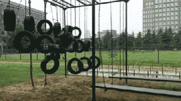 障碍简介:轮胎攀台由吊板、悬挂轮胎、麻绳和软梯等构成,锻炼训练者通过空中障碍物的能力,提升身体的协调性。