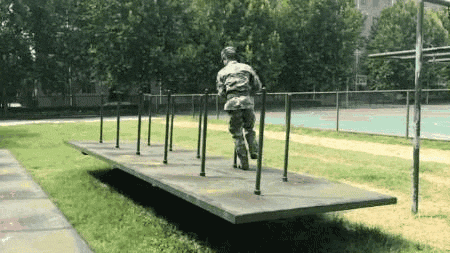 障碍简介:晃动横梯由竖杆、铁链和横梯构成,梯杆高低分布,行进过程中横梯晃动,锻炼训练者的平衡性和协调性,克服恐高情绪。