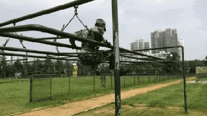 完成方法:迅速通过吊板,逐个跳上轮胎,爬至最高处,利用麻绳或软梯落地。