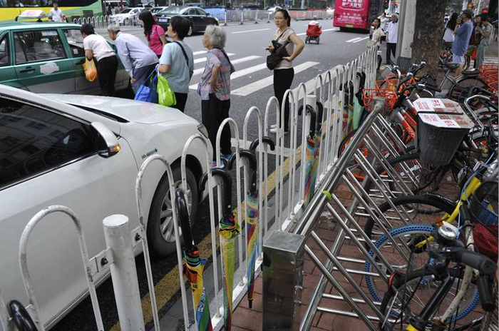 近日,市民到越秀区烈士陵园周边逛街不难发现,路边的护栏处多了一排排五彩色的共享雨伞。据了解,这批名为“e伞”的共享雨伞主要集中在天河区和越秀区,市民只要实名注册并交纳押金,再扫描二维码,输入雨伞密码即可借走雨伞。