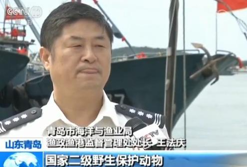 青岛市海洋与渔业局渔政渔港监督管理处处长 王法庆:这头鲸鲨是国家二级野生保护动物,目前已委托青岛水族馆进行了保护性的处置。