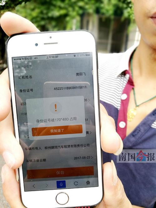 黄先生考虑到自己已有多年驾龄,而刚购买的新车也符合滴滴司机的要求,于是在8月27日便用“滴滴出行”的客户端进行注册,在填写资料提交后,立刻跳出一行“身份证号被170*480占用”的提示。