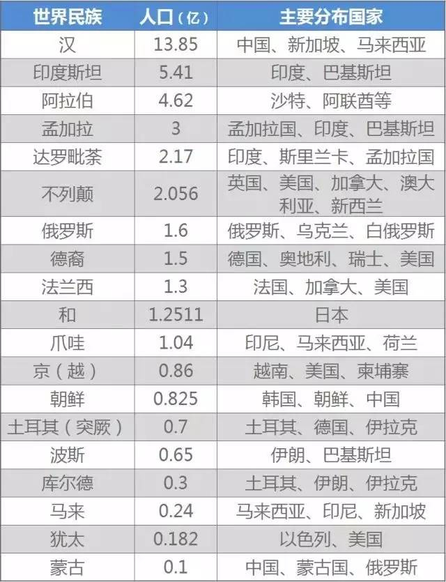 我们特地在世界范围内选取了一些大家熟知以及关心的民族,列出人口数据,来进行对比。