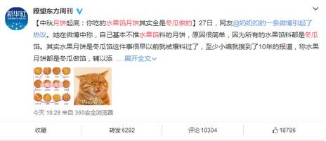 27日,网友@奶奶扣的一条微博引起了热议。她在微博中称,自己基本不推水果馅料的月饼,原因很简单,因为所有的水果馅料都是冬瓜馅。