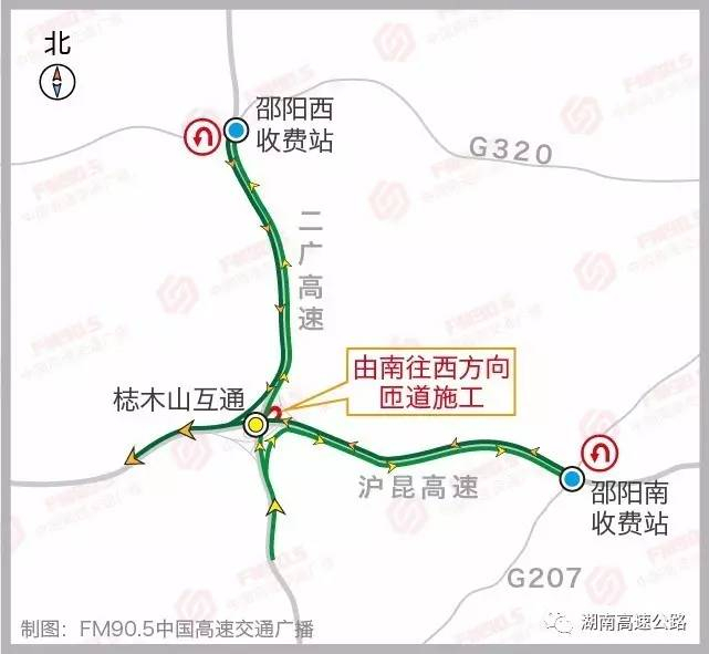 本次封闭车道施工期限为2天,影响的车流量为从邵永高速公路北上转沪昆高速前往怀化、昆明的车辆。怀化、昆明方向车辆需经邵阳南、邵阳西收费站绕行。具体分流路线为: