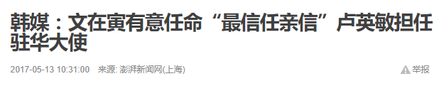 外事儿(微信ID:xjb-waishier)注意到,其实早在今年5月,也就是文在寅就任总统没几天后,韩国媒体当时就曝出,文在寅打算任命“最信任亲信”卢英敏担任驻华大使。