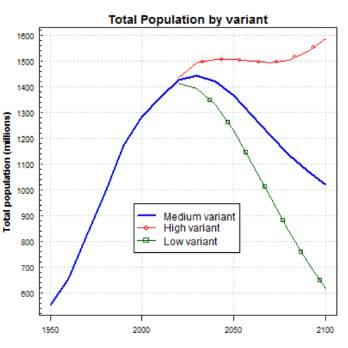 (中国人口增长趋势预测,分为低生育率、中等生育率、高生育率三种方案
