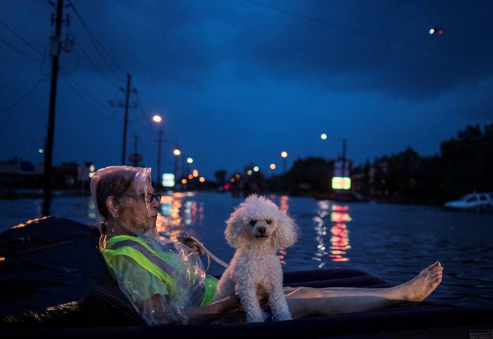 休斯敦的盛夏,原本30多度的气温因飓风“哈维”的到来骤降到24度。避难所里,浑身湿漉漉的人们坐在地上,身下仅有一条毛毯。