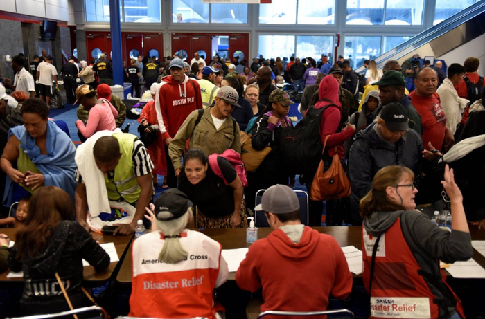 当地政府在28日下午宣布开辟舒格兰棒球体育场为临时避难所。消息公布几小时后,这里就接收了数百灾民。