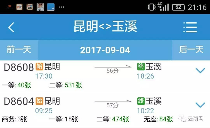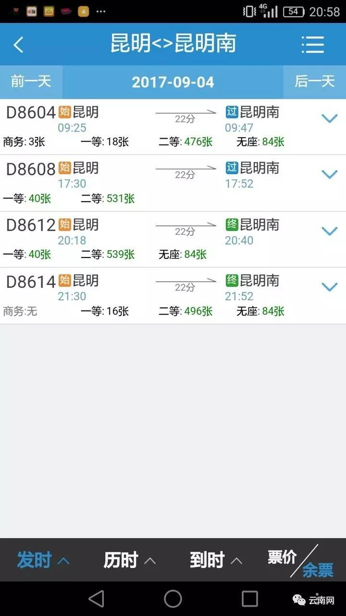 中国铁路客服服务中心12306官方网站、携程网、去哪网等平台显示,已经可以查询到9月4日当天昆明站前往昆明南站的动车车次和票价。