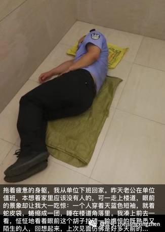 我凑上前去一看,怔怔地看着眼前这个胡子拉碴一脸憔悴的既熟悉又陌生的人,回想起来,上次见面仿佛是好多天前的事情。寻思着我是有多久没见到他了,他为什么要睡在家门口,我轻轻地叫醒了躺在门口睡觉的丈夫:“你昨天不是值班吗,怎么跑回来了?还有为什么好好的家里不睡,要睡在家门口走廊上?”