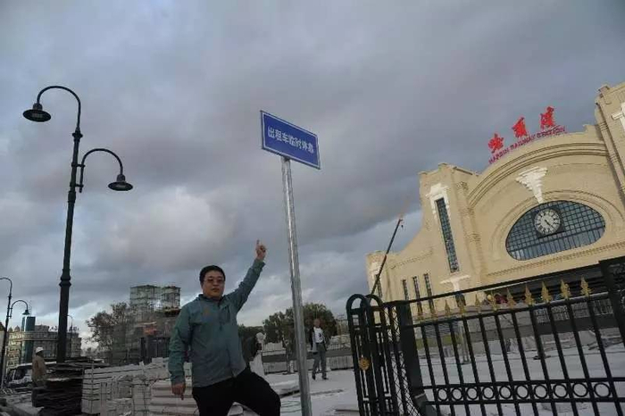 “新哈站”外围的交通指示牌和出租车临时停靠点