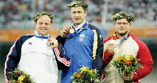 亚当·纳尔逊(左)在2004年获得奥运会银牌。由于金牌得主尤里·比洛诺格(中)服用禁药,纳尔逊于9年后成为冠军。
