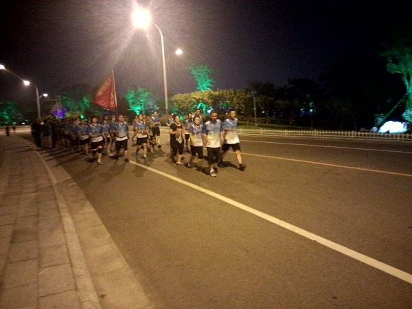 暴走团队首有队员打着旗帜,而在队尾,则跟随着一辆叉车,叉车距离队尾队员只有4米左右,叉车上也悬挂着暴走队的旗帜。