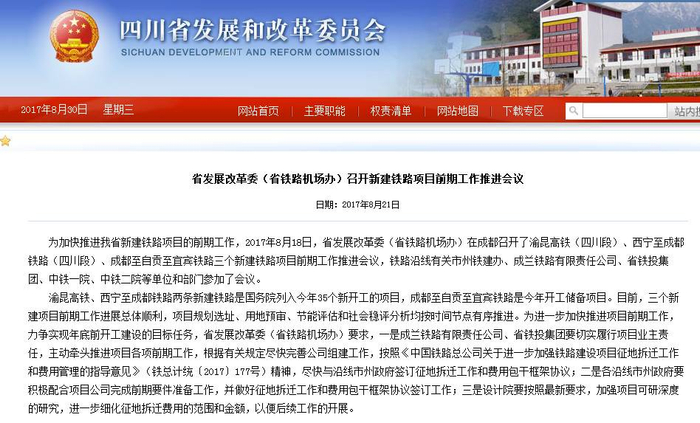 最近,四川省发展改革委在成都召开了渝昆高铁(四川段)、西宁至成都铁路(四川段)、成都至自贡至宜宾铁路三个新建铁路项目前期工作推进会议,推进新建铁路项目的前期工作。其中,成都至自贡至宜宾铁路是今年开工储备项目。