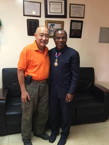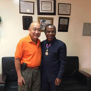 《西非统一商报》董事长胡介国(左)与利比里亚卫生部副部长Minister Saah Charles N'tow。(图片由受访者提供)