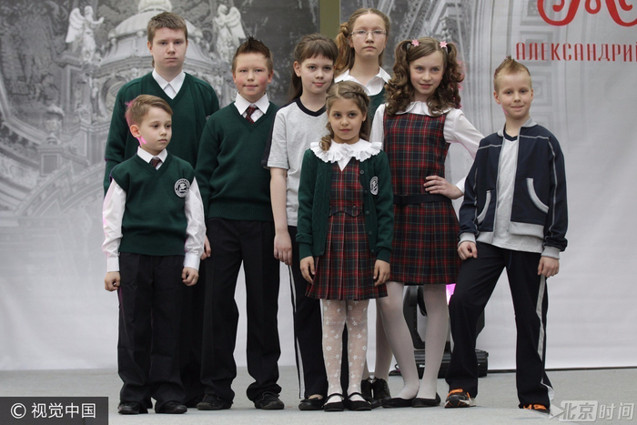 当地时间2013年4月25日,俄罗斯圣彼得堡,小模特们展示校服。学校校服和舞会礼服节Aleksandriyka在当地举行。