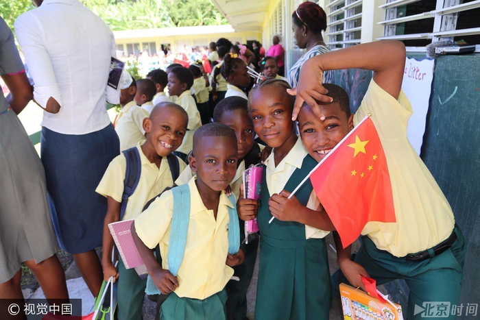 当地时间2015年12月8日,格林纳达,在圣乔治教会小学,小学生拿着中国国旗参加与和平方舟官兵的联谊活动。