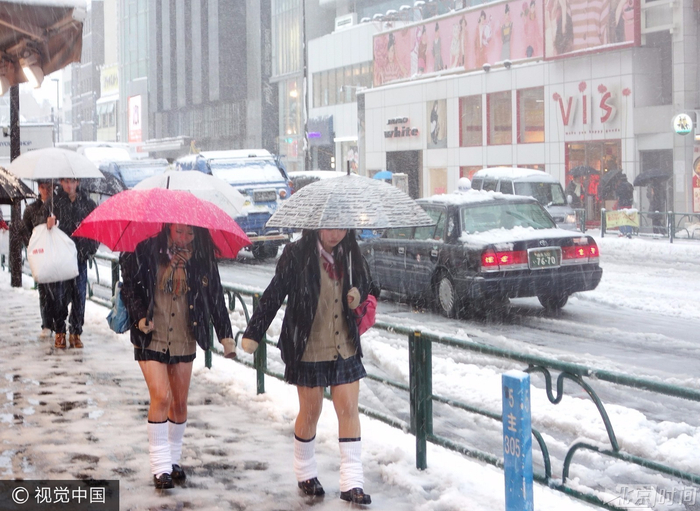 当地时间2013年01月14日,日本东京,雪中行走的高中女生。