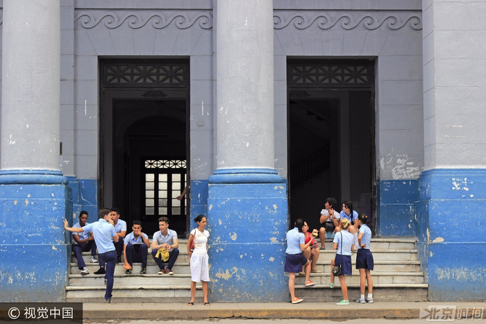 2015年2月28日,古巴圣克拉拉,古巴学生身穿校服在课间休息。