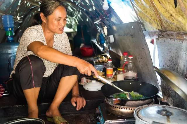 中午时分,57岁的渔民朱美娥开始做饭。船上没有自来水,煮饭洗菜全是使用柳江河水。