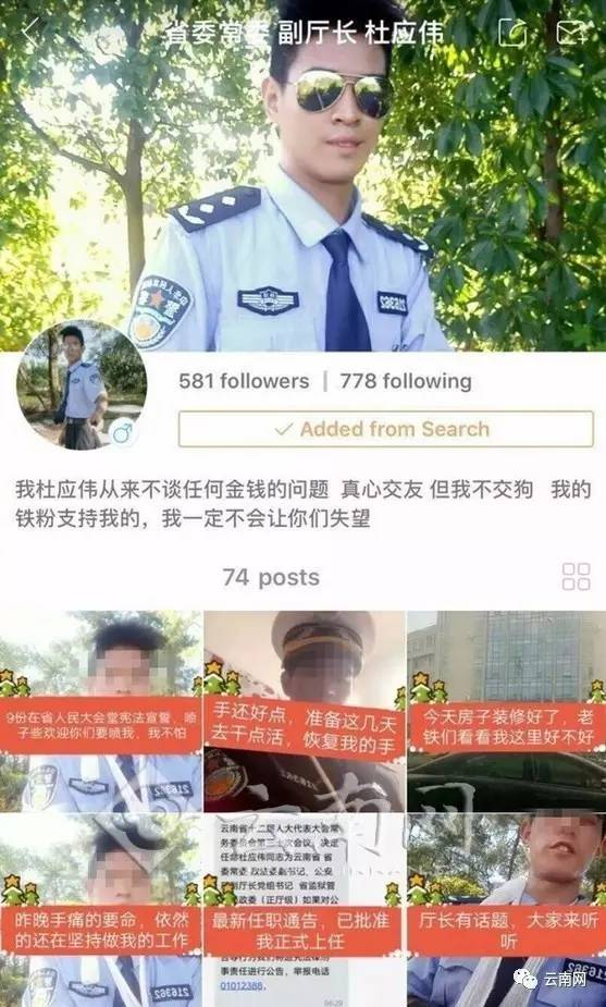 云南网(微信公号:yunnancn)注意到,在网友配发的图文中,一网名为“省委常委 副厅长杜应伟”的年轻男子在快播平台发布了多段身着警服,戴着墨镜的视频和图片内容,并配文称自己今年20多岁了,家里天天逼着他相亲,让单身美女联系他。