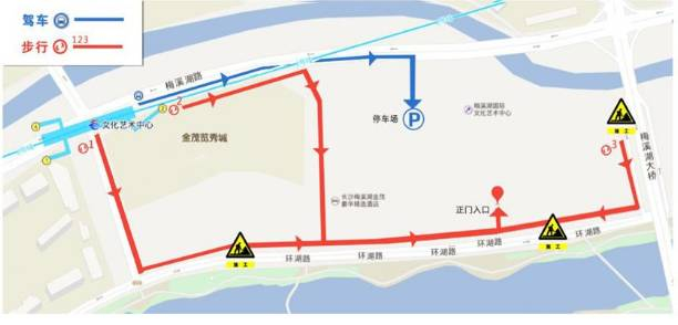 ↑记者实地发现,上面这张官方发布的路线图有偏差。正确驾车线路是:导航目的地为“金茂览秀城”,沿红色路线2行驶,下坡10米即到达,目的地在道路左侧