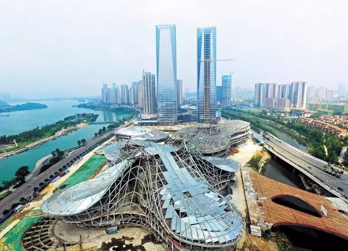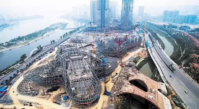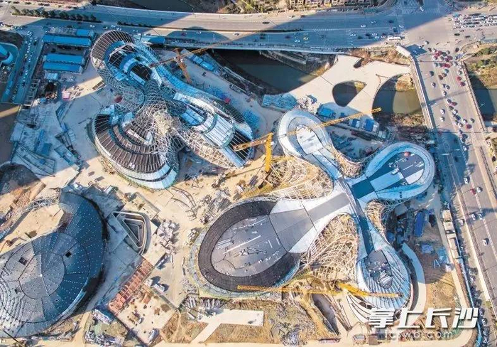 ↑2015年9月17日,梅溪湖国际文化艺术中心三大主体钢结构“芙蓉花瓣”造型初现,即将启动外立面幕墙施工。