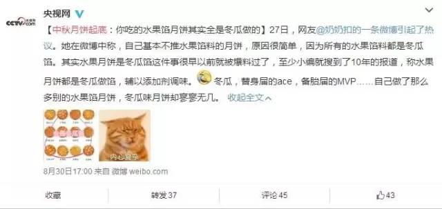 网友在微博中称,自己基本不推荐水果馅料的月饼,原因很简单,因为所有的水果馅料都是冬瓜馅。