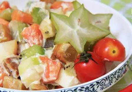 将月饼切成小块,然后白菜心、小西红柿、苹果肉、当然少不了沙拉酱,也可根据自己喜好放其他水果。