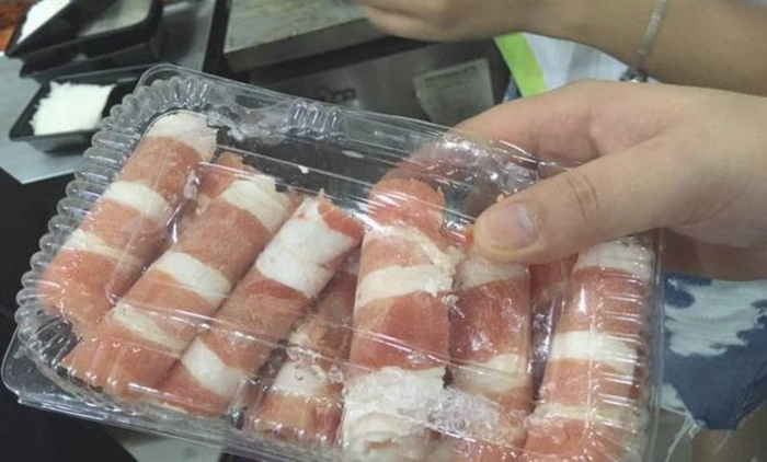 执法人员发现一盒牛肉卷没有任何标签标识,产地,生产日期,保质期均不明。稍后执法人员将检查这些半成品的进货索证索票。