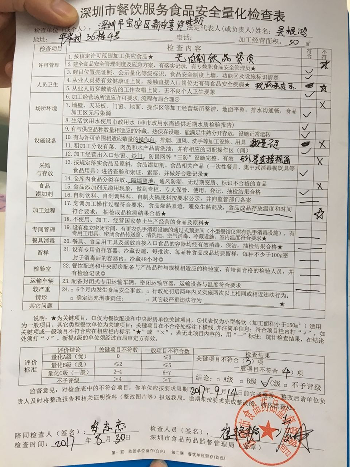 截至今年7月底 深圳市已经有1076家餐厅被评为A级